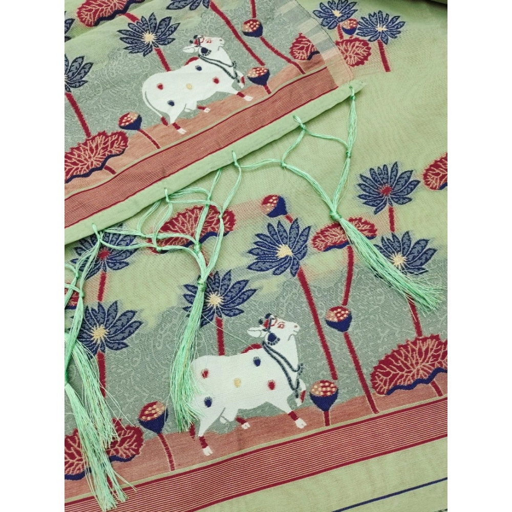Women's Banarasi Silk Printed Unstitched Salwar Suit Material With DupattaColor: Pista, Material: Banarasi Silk Pattern: Printed, Top Fabric Length: 3MtrsBottom Fabric Length: 2.50Mtrs, Dupatta length: 2.30MtrsDisclaimer: The color of actual product may vary slightly from the images provided due to photographic lighting conditions and difference in screen resolutions.